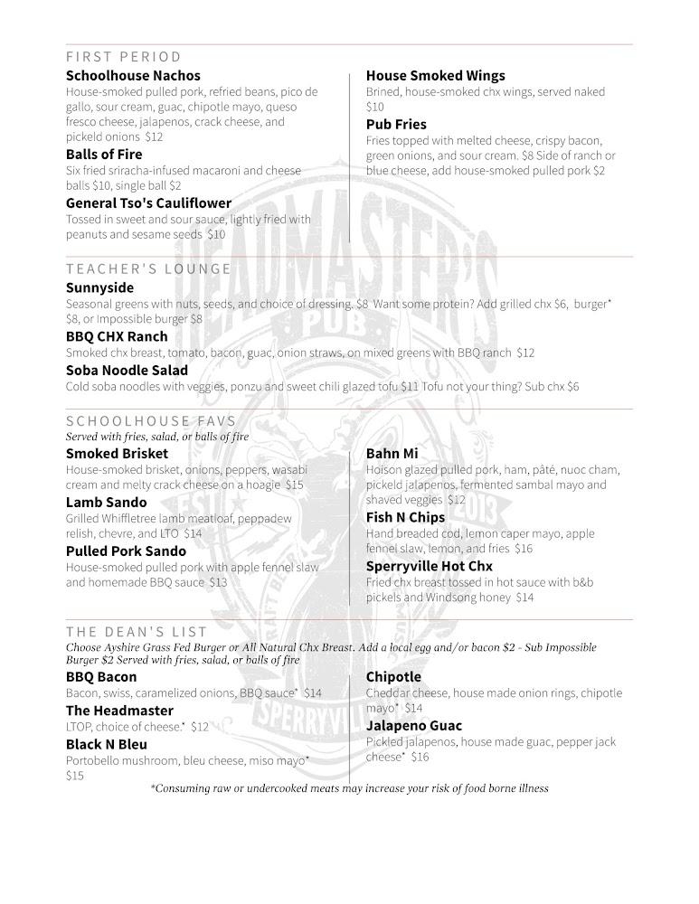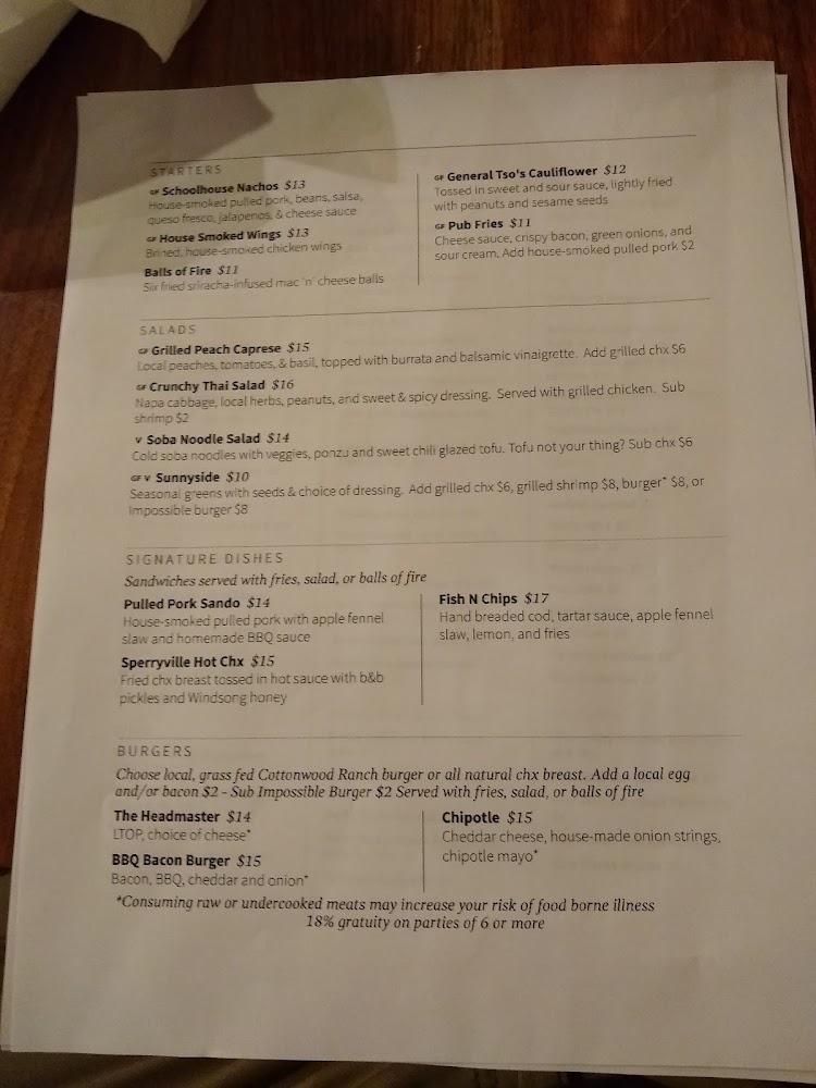 Starters like Schoolhouse Nachos and Balls of Fire kick off the dining experience. Unique options such as General Tso's Cauliflower appeal to adventurous eaters. The main courses include BBQ Chicken Ranch and Soba Noodle Salad, ensuring variety on every visit.